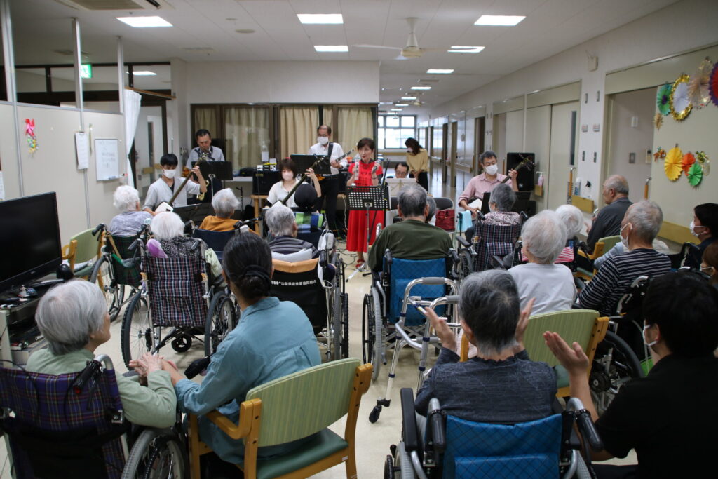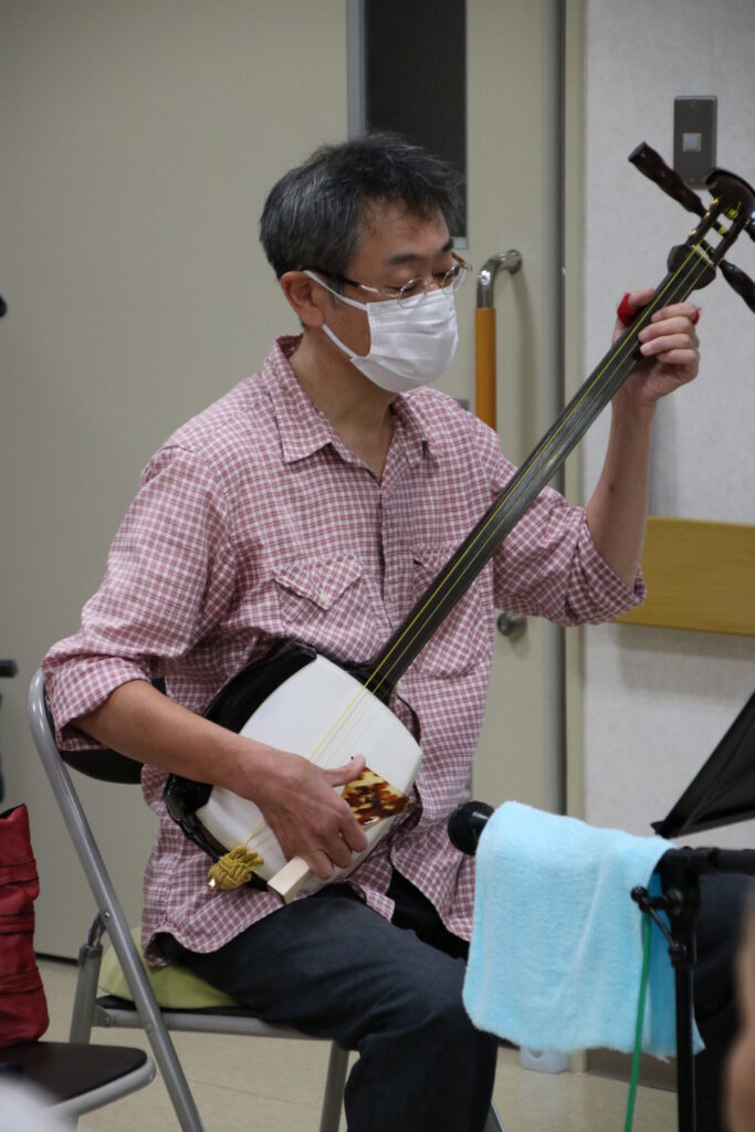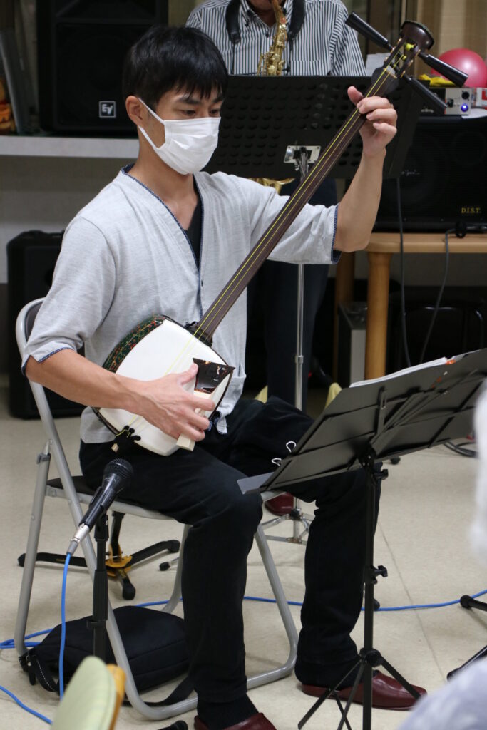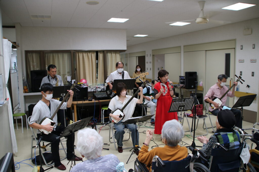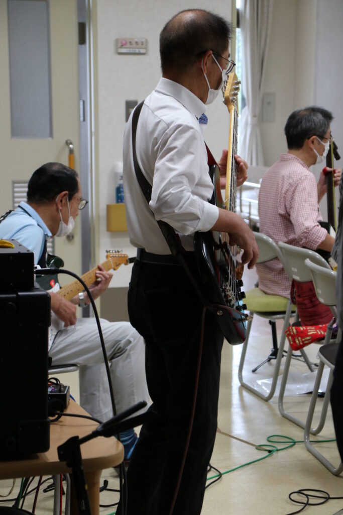 日本古来の津軽三味線から洋楽器のエレキギター、ベース、サックスのコラボです。その迫力と音色の美しさには入所者も驚いた様子。