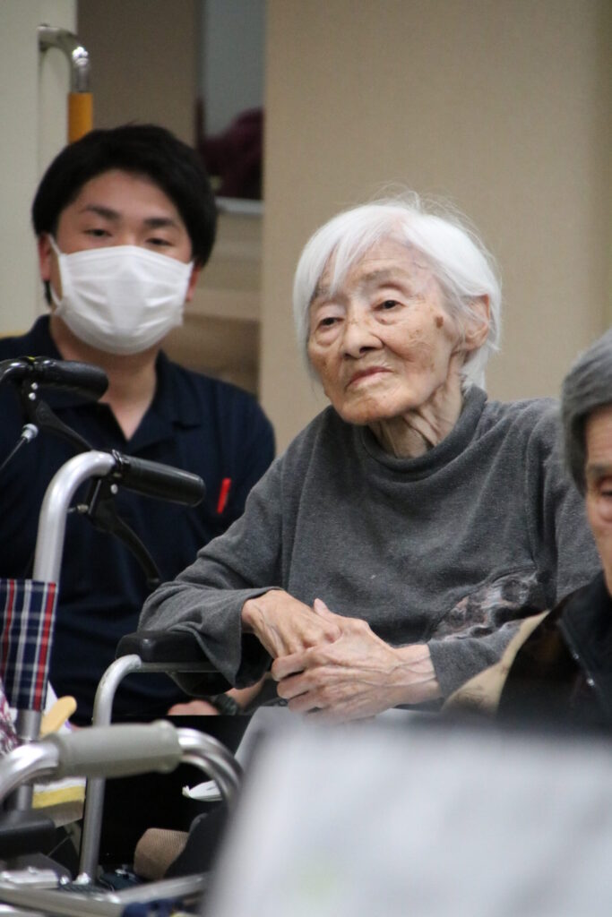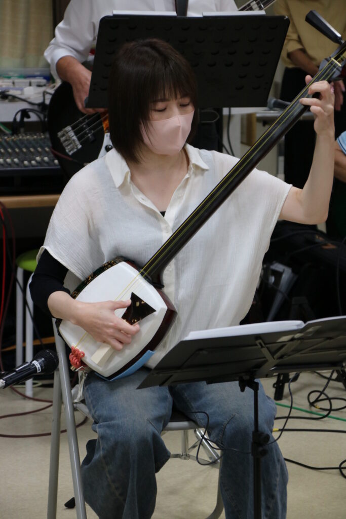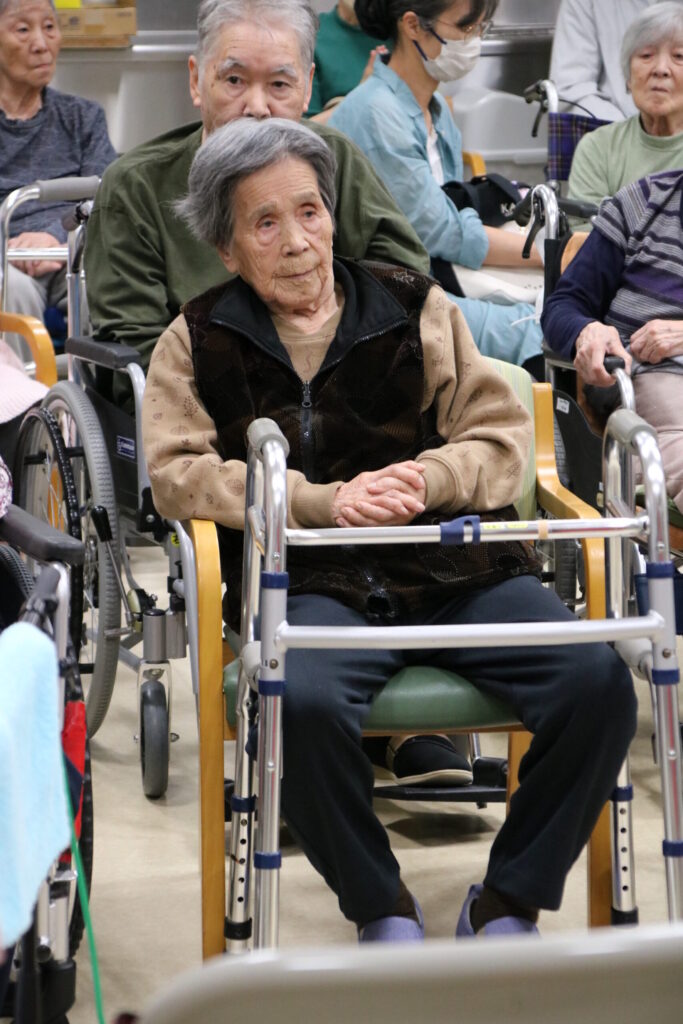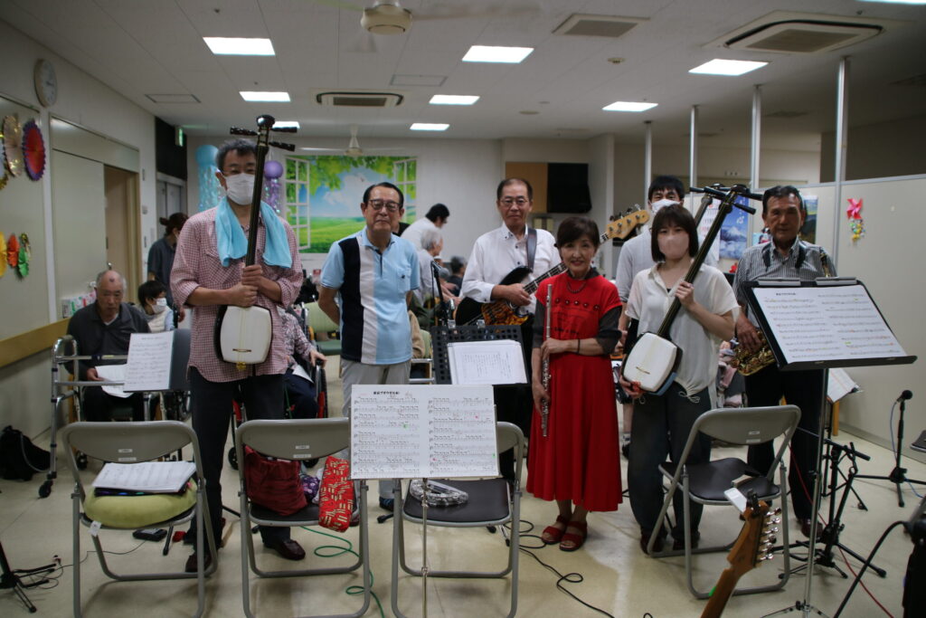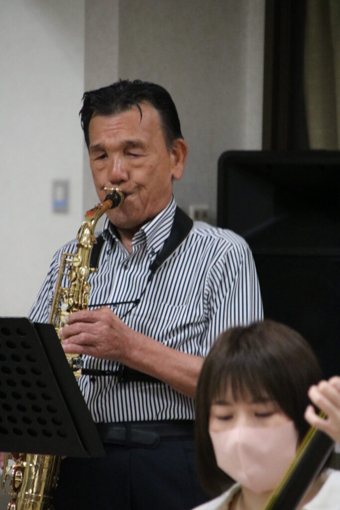 日本古来の津軽三味線から洋楽器のエレキギター、ベース、サックスのコラボです。その迫力と音色の美しさには入所者も驚いた様子。