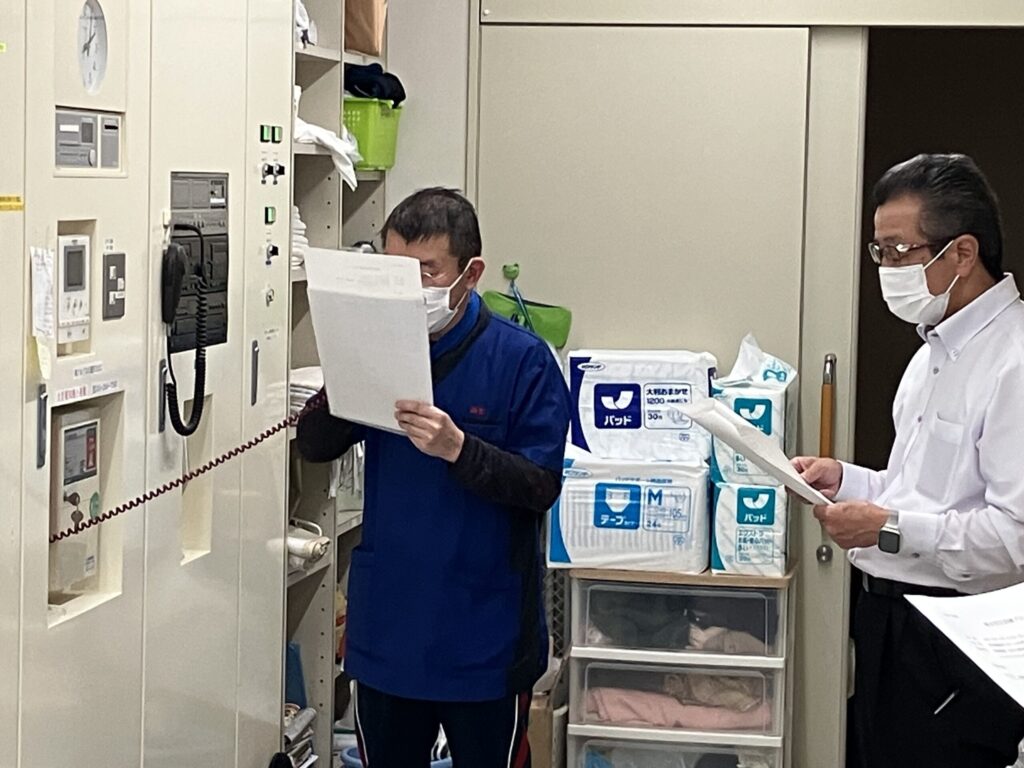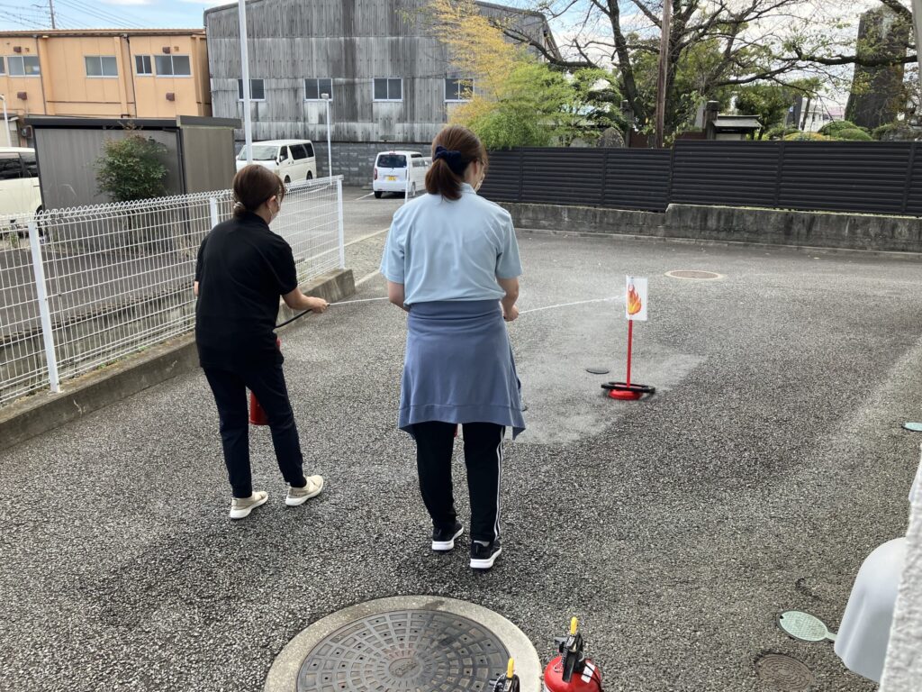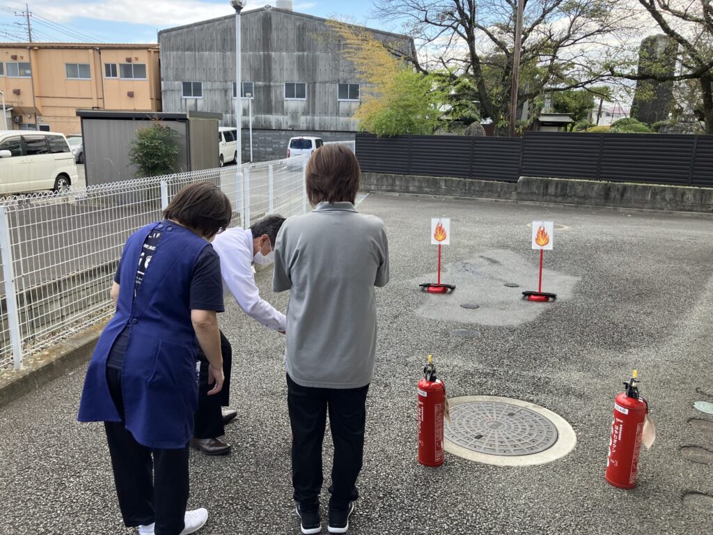 先ずは消防本部との連絡訓練です。特別養護老人ホームでは火災報知機は消防本部と直結していますので即座に消防車は出動、状況を伝えながら向かってくれることとなっています。その後は消火器訓練、毎回ですが実際に手に取って重さと圧を実感しながら手順を体に覚えさせることが大切です。