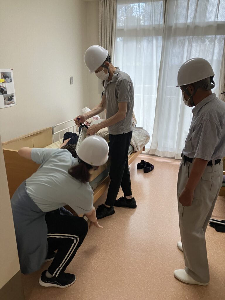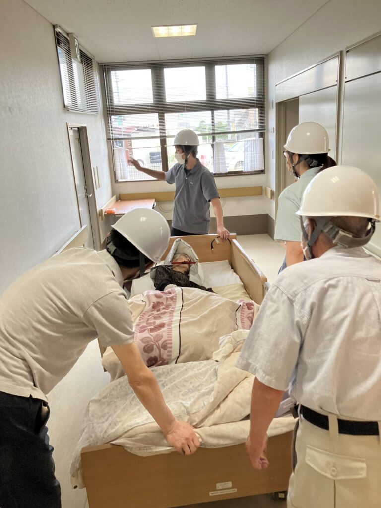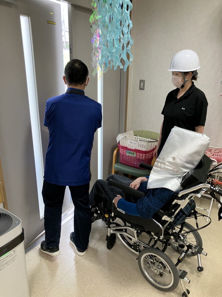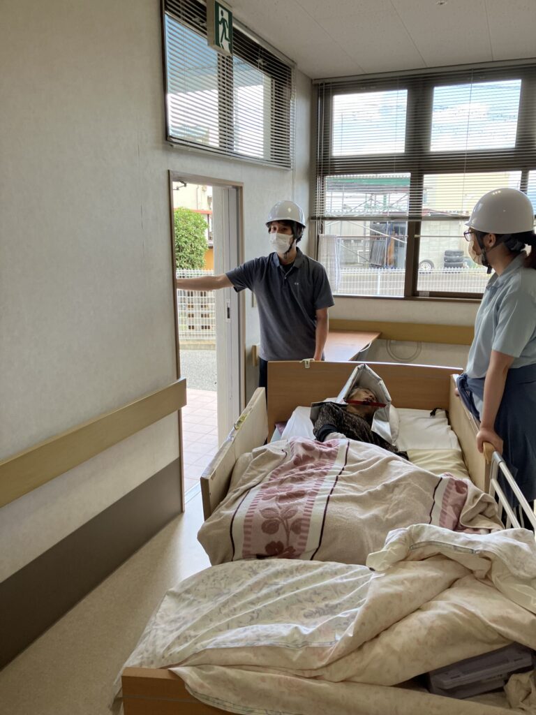 ベッドから移乗することが出来ない場合はベッドで非難を行います。その時の状況によりどの避難口から避難するかを決めることも大切です。