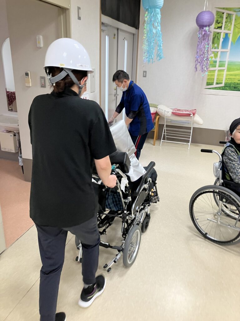 車イスに移譲しての避難、防災頭巾で頭の安全も確保します。建物は鉄筋コンクリート、白峰荘ではスプリンクラーも自動で稼働しますので、心配されるのは煙、場合によってはユニットから直接外への避難も行います。