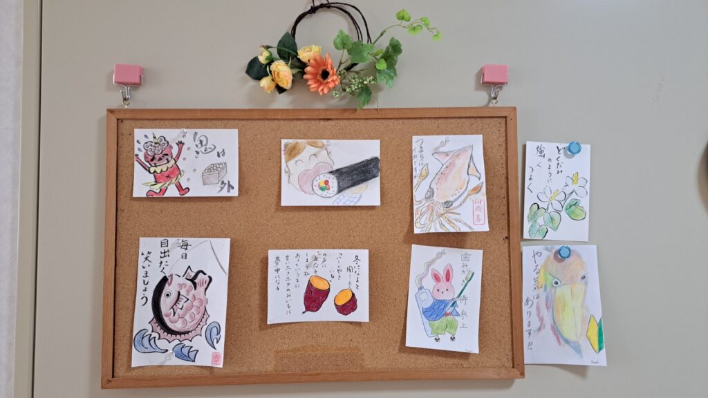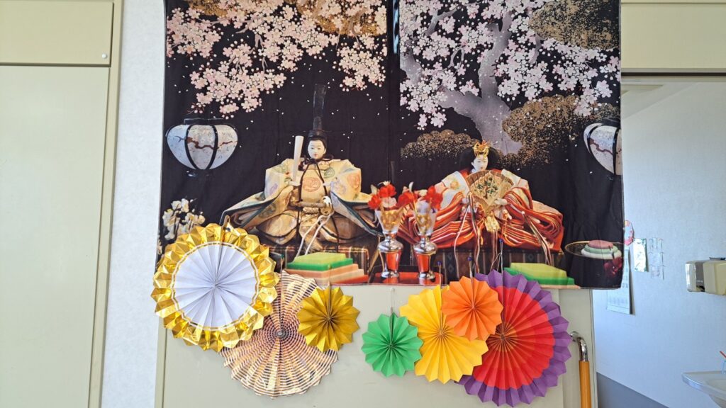 そろそろひな祭りの季節ですね。山梨では旧暦で4月3日になる地域がおおいのですが、白峰荘では賑やかにお雛様とお内裏様の登場です。職員がメルカリでゲットしたと言うタペストリーも綺麗です。